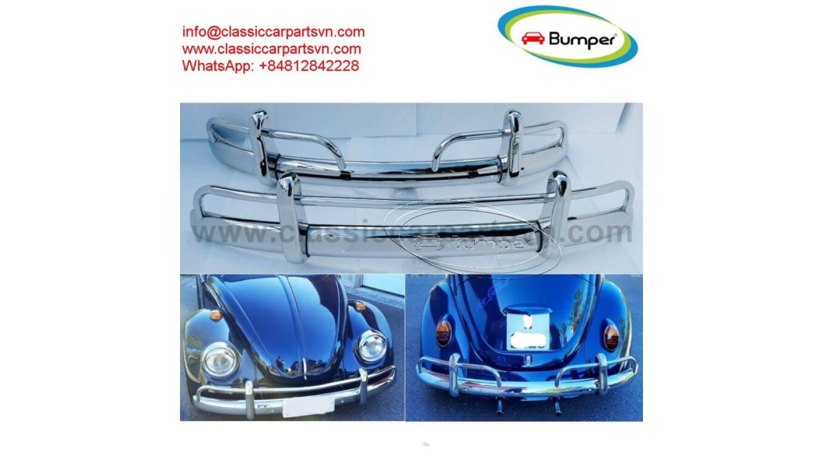 VW Beetle USA style (1955-1972) bumpers by stainless steel new A set of a front bumper, a rear bumper, 4 x over riders, front and rear towel rails, bolts and screw. This bumpers don’t fit VW beetle 1302, 1303 Mexican nor super beetle models. If your car is VW beetle 1302, 1303 Mexican, please let me know. The product has shape and size like the original samples. So, They perfect fit on the car. Products are made of 304 stainless steel imported from Japan and India, especially with a chrome content higher than 30%, so they never rust, do not corrode or peel over time. Polished product – with a perfect shine (like chrome). This is the perfect replacement. Please visit the link: classiccarpartsvn.com/product/vw-beetle-usa-style-1955-1972-bumpers/ If you need all parts for any classic car, Please contact me. Web: classiccarpartsvn.com Email: info@classiccarpartsvn.com Fanpage: : www.facebook.com/profile.php?id=100088684251588 WhatsApp: +84 81284 2228 More than that, we always want to work towards developing more new models. So we are searching for samples from any customers who can cooperate with us to expand some kinds of products in stainless steel, rubber, steel, aluminum, copper, chrome such as bumpers, trims, plate number frames, parts of classic cars, modern cars, stainless steel tools for high-class bathrooms, stainless steel parts for high-end tables and chairs.VW Beetle USA style (1955-1972) bumpers by stainless steel new A set of a front bumper, a rear b...